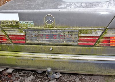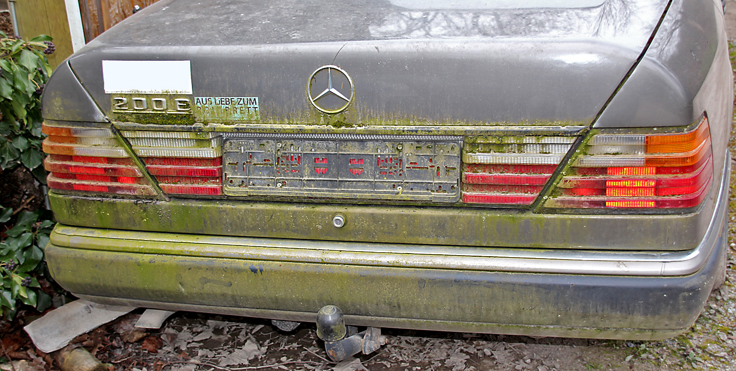 …das Leben steckt voller Überraschungen. Vor allem am Freitag. Besonders in Sackgassen. Sogar am Waldrand. Hier lädt der fröhliche Bryologe zum Fachgespräch. So viel Heckdeckelmoos (Musculus Cofanus Posteriorus) sieht auch er nicht jeden Tag. Der 124er Limousine kleben haploide Gametophyten an der Abrisskante, als hätten sie sich dort zum Bowling verabredet. Halbnackt, grün, immer unter freiem Himmel. Meine Fresse, was für`n geiles Leben. Die Hochstimmung verfliegt, als sich Kilometerstand und Polster in die Bildmitte drängen. Nur 144K mit Seitenwange Jungfrau in Karo Stoff auf Fahrerseite? Als Mopf Einsfünf in 172? Wie kann das sein? Nix als Fragen. Ich fühle mich kurz geoverbeckt. Doch dann öffnet Irgendein Ecki die Haustür, lächelt mich an, wirft mir die Wagenschlüssel zu und sagt: Nimm ihn doch einfach mit Mann. Fortsetzung folgt…